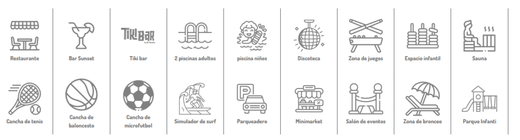 Un Mundo de Diversión Acuática: Refréscate y juega en nuestras dos piscinas para adultos y una piscina especial para niños. Y para los más audaces, ¡atrévete a domar las olas en nuestro espectacular simulador de surf!